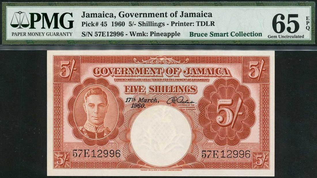 (x) Government of Jamaica, 5 shillings, 17 March 1960, serial number 57E 12996, orange on multicolour underprint, George VI at left, value at right and each corner, reverse orange, arms at top centre