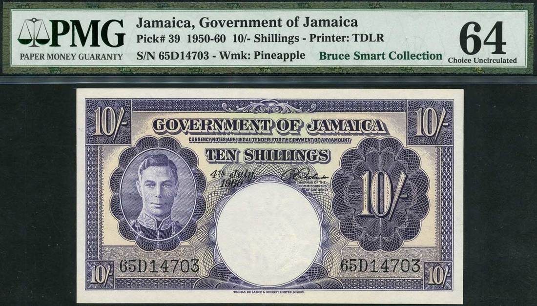 (x) Government of Jamaica, 10 shillings, 4 July 1960, serial number 65D 14703, purple on multicolour underprint, George VI at left, value at right and each corner, reverse purple, arms at top centre