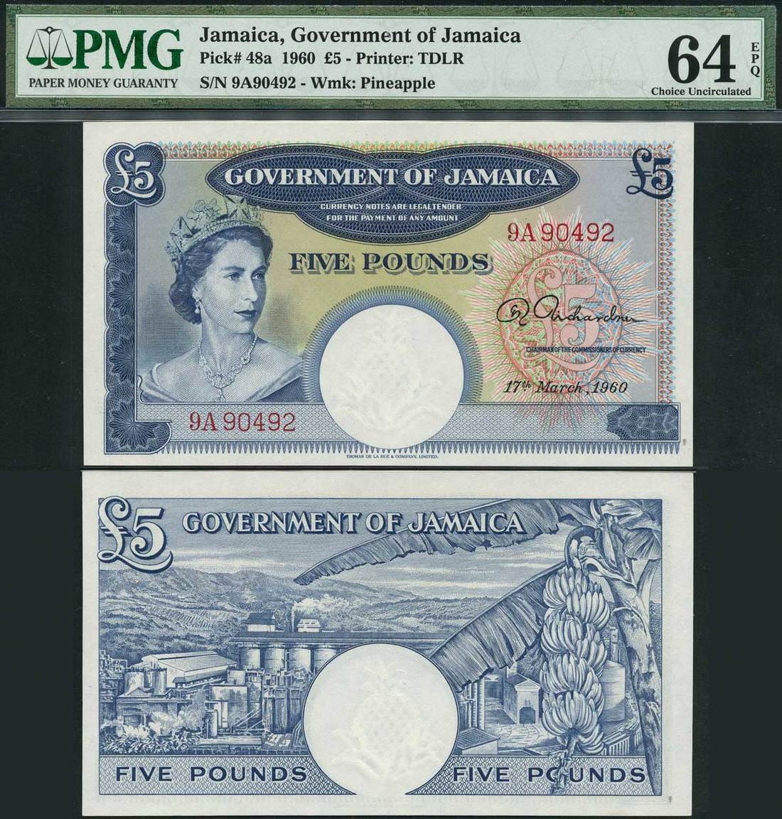 (x) Government of Jamaica, £5, 17 March 1960, serial number 9A 90492, blue on multicolour underprint, Elizabeth II at left, value at centre, top left and right, reverse blue, Bauxite mine and banana tree