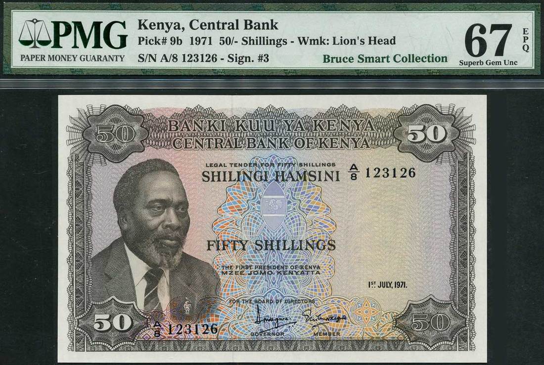 (x) Central Bank of Kenya, 50 shillings, 1 July 1971, serial number A/8 123126, brown on multicolour underprint, Kenyatta at left, arms at centre, value at corners, reverse, brown, cotton picking