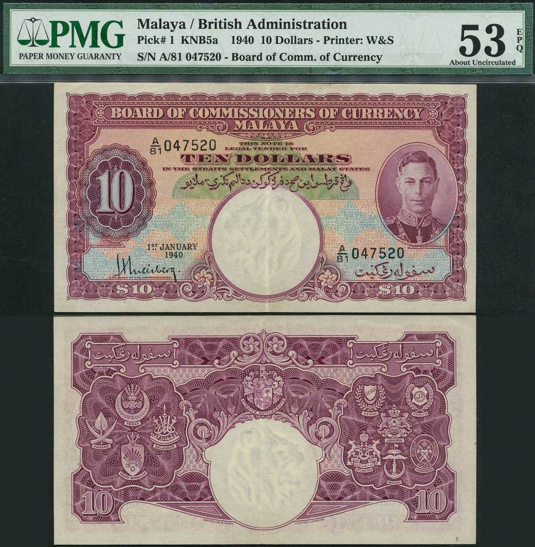 (x) Board of Commissioners of Currency, Malaya, $10, 1 January 1940, serial number A/81 047520, purple on multicolour underprint, George VI at right, value at left, reverse purple, 11 coats of arms