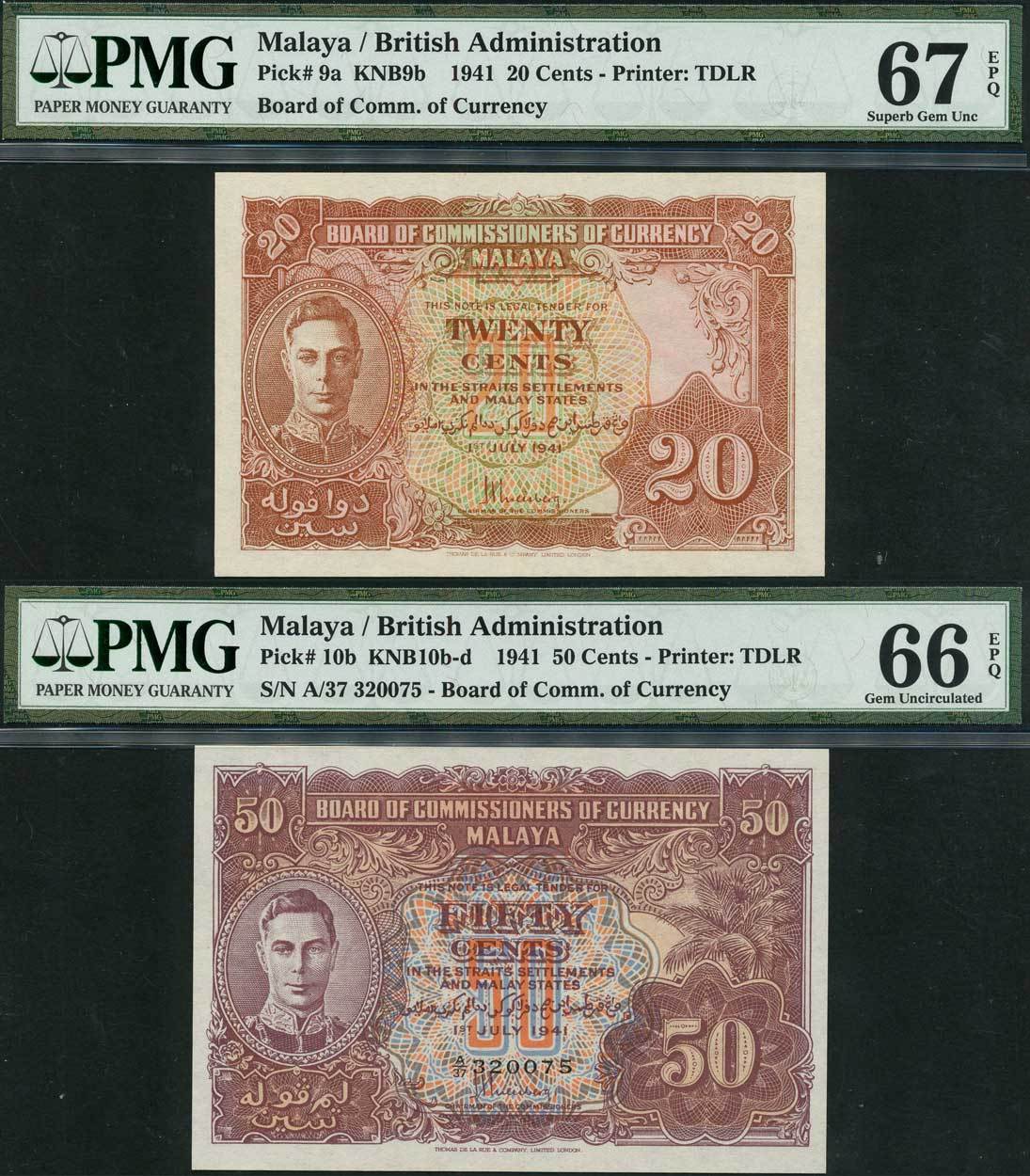 (x) Board of Commissioners of Currency, Malaya, a group of the 1941 small change issues, comprising 1 cent, purple, 5 cents, red, 10 cents, blue, 20 cents, brown, and 50 cents, purple, all with George VI at left