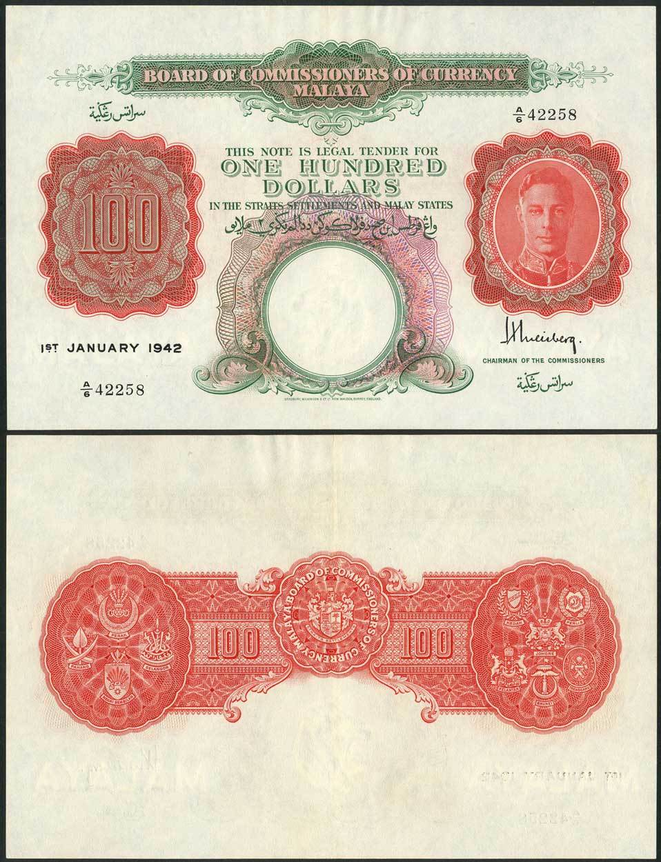(x) Board of Commissioners of Currency, Malaya, $100, 1 January 1942, serial number A/6 42258, red and green on multicolour underprint, George VI at right, value at centre and left, reverse red, 11 coats of arms and values
