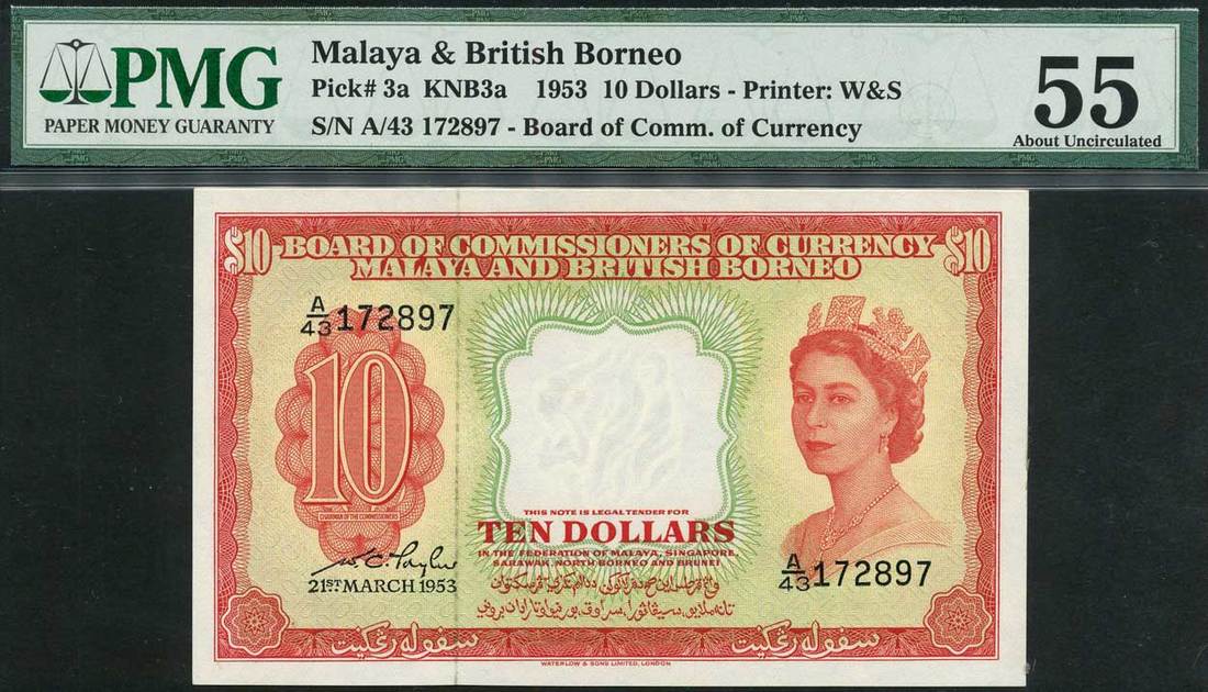 (x) Board of Commissioners of Currency, Malaya and British Borneo, $10, 21 March 1953, serial number A/43 172897, red on green underprint, Elizabeth II at right, value at left, reverse red, 16 coats of arms