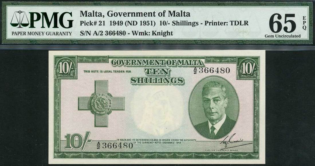 (x) Government of Malta, 10 shillings, 1949, serial number A/2 366480, green on purple underprint, George VI at right, George Cross at left, value at low left and top corners