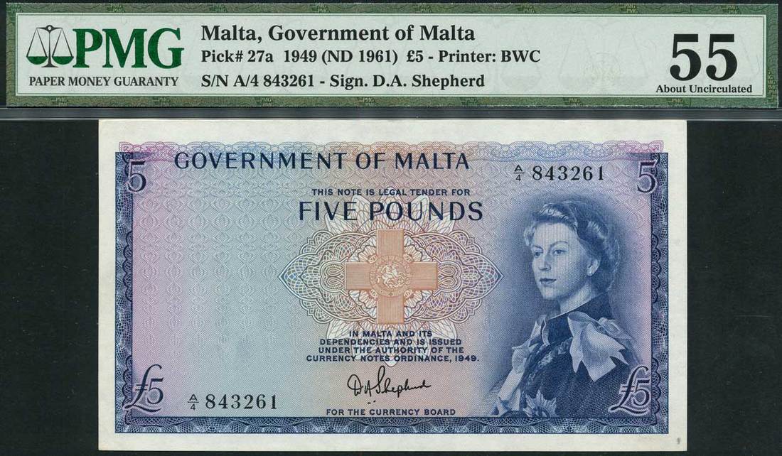 (x) Government of Malta, £5, ND (1963), serial number A/4 843261, blue on multicolour underprint, Elizabeth II at right, George Cross at centre, value at corners, reverse blue, Valetta Harbour, Shepherd signature