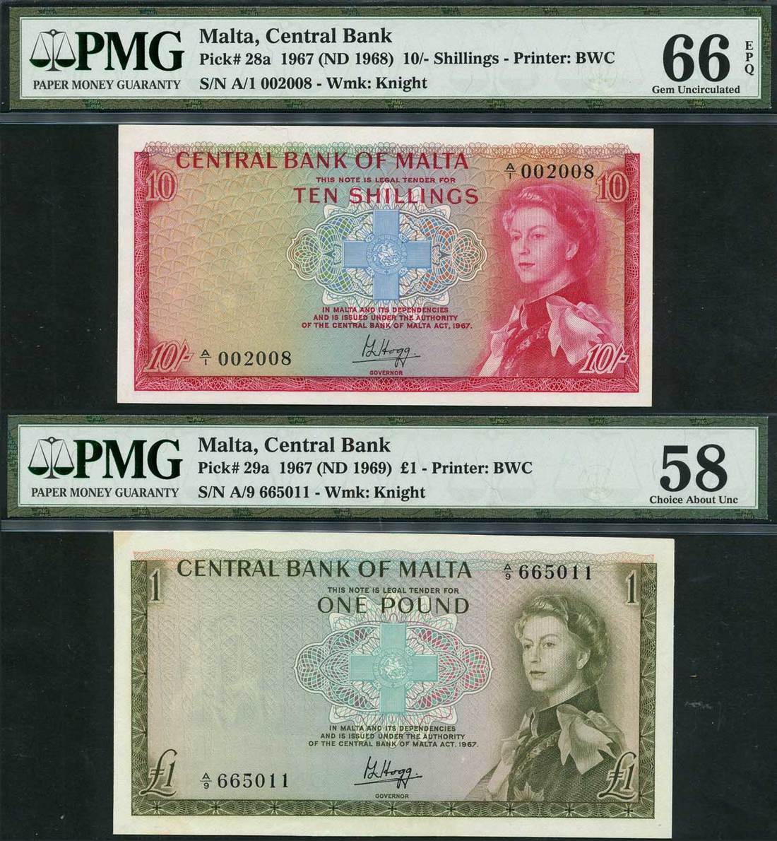 (x) Central Bank of Malta, 10 shillings and £1, 1967, serial numbers A/1 002008 and A/9 665011, red and olive brown respectively, Elizabeth II at right, George Cross at centre, value at corners