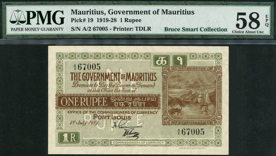 (x) Government of Mauritius, 1 rupee, 1 July 1919, serial number A/2 67005, uniface, brown and green, sailing ship and small boat at right