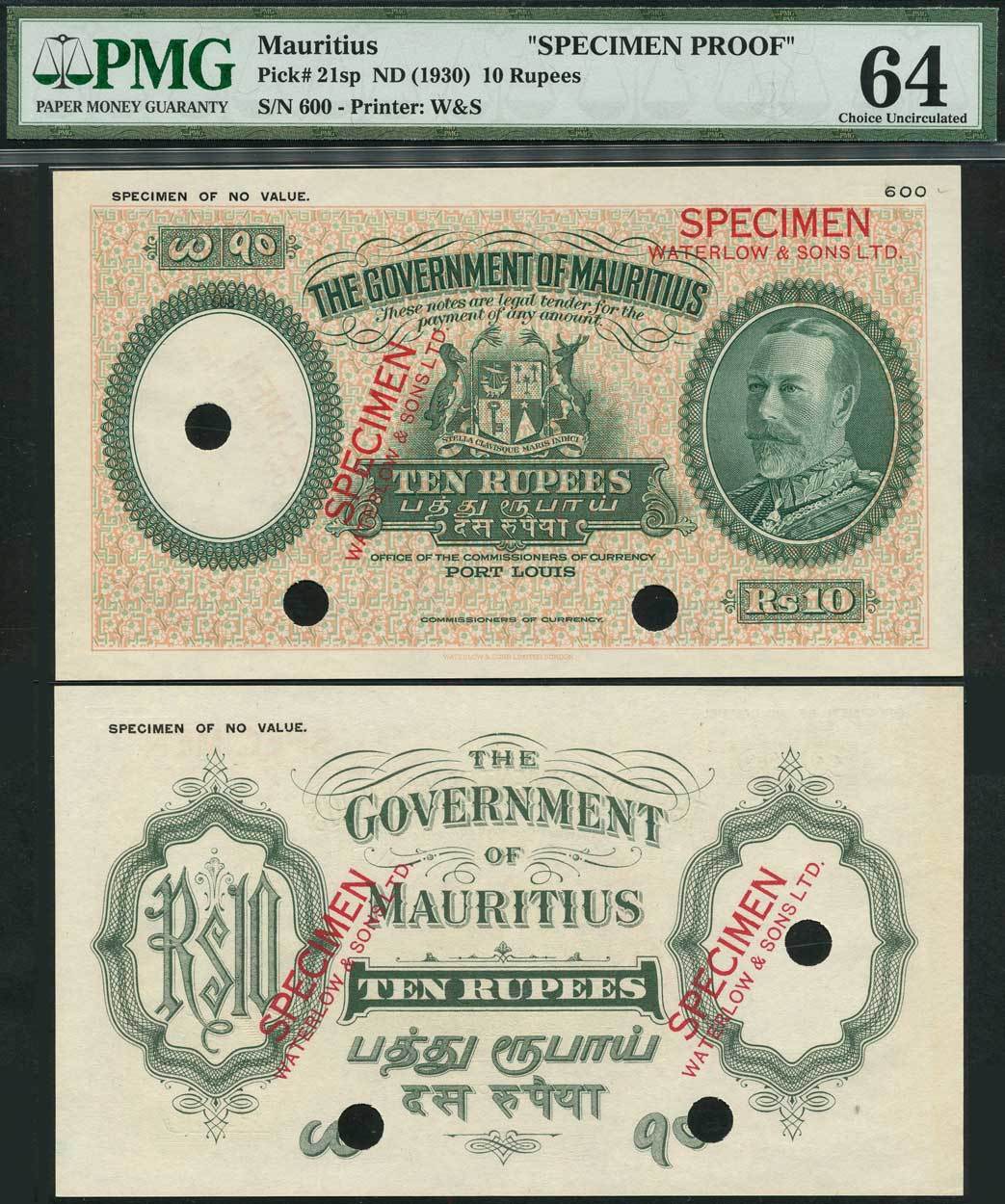 (x) Government of Mauritius, colour trial 10 rupees, ND (1930), no serial numbers, green on multicolour underprint, George V at right, arms at centre, red SPECIMEN WATERLOW & SONS LTD. overprints, three cancellation holes