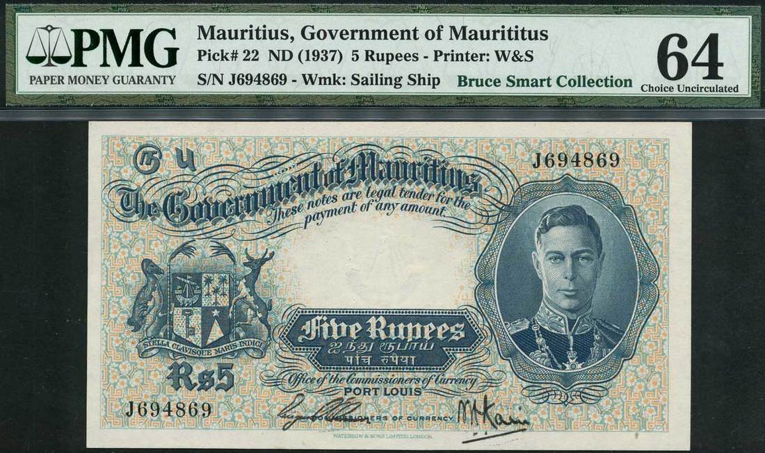 (x) Government of Mauritius, 5 rupees, ND (1937), serial number J69869, blue on multicolour underprint, George VI at right, arms at left
