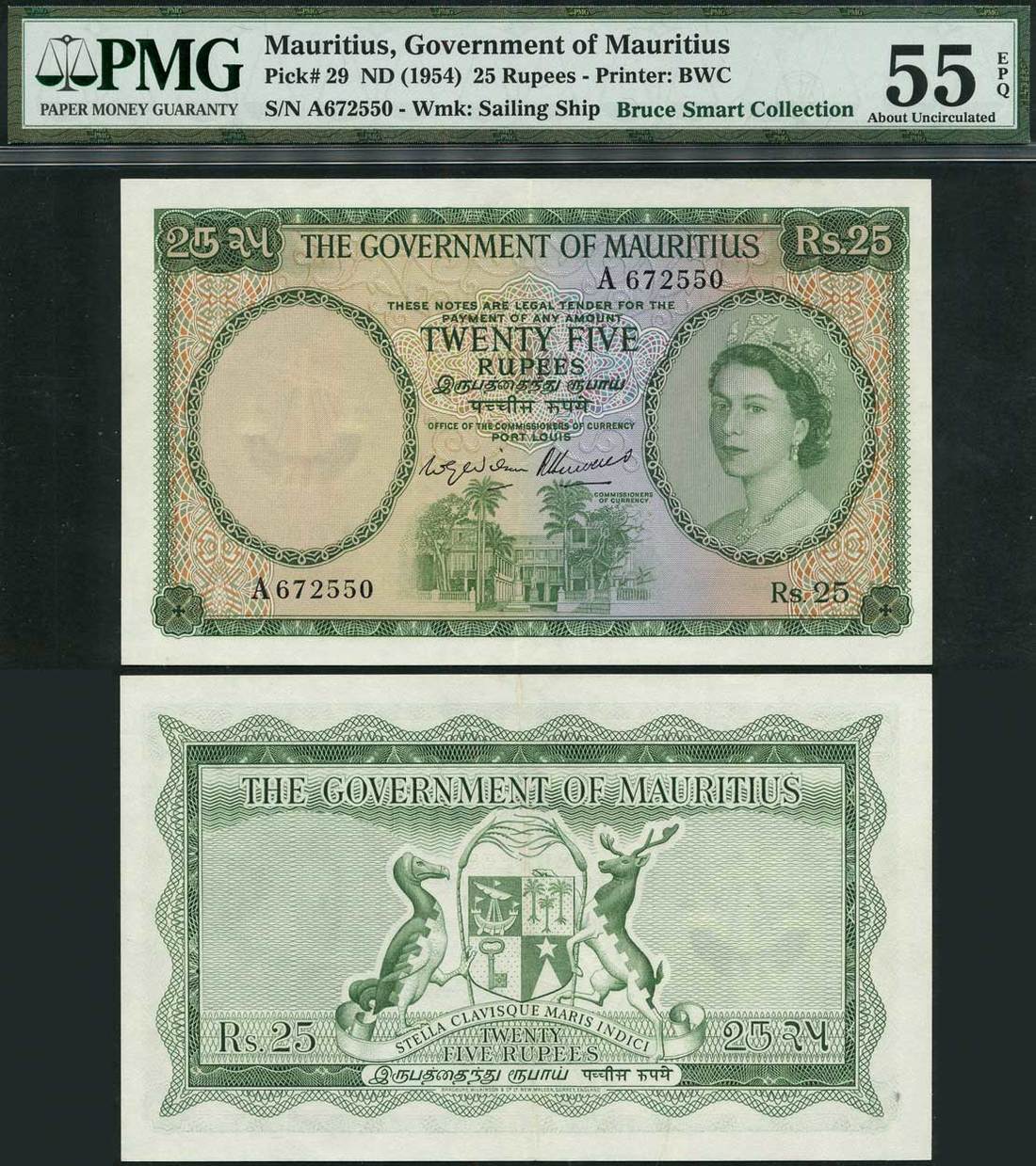 (x) Government of Mauritius, 25 rupees, ND (1954), serial number A672550, olive green on multicolour underprint, Elizabeth II at right, boats and harbour at low centre, reverse olive green, arms at centre