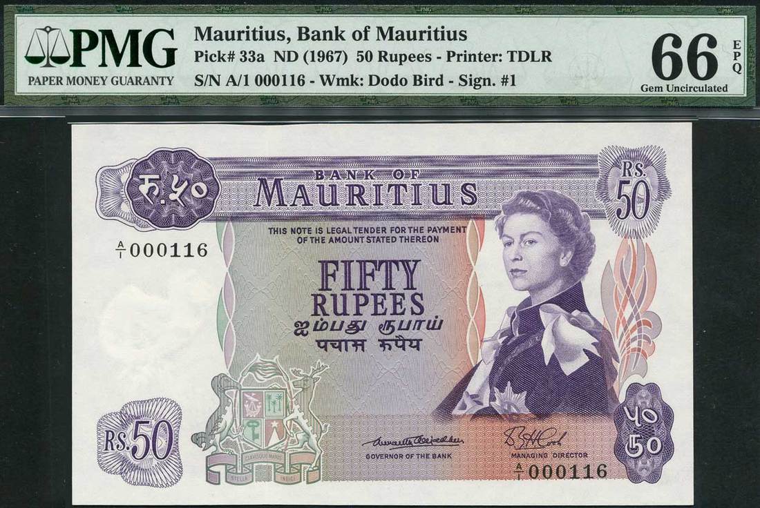 (x) Bank of Mauritius, 50 rupees, ND (1967), serial number A/1 000116, purple on multicolour underprint, Elizabeth II at right, arms at low left, value at centre and corners, reverse purple, ships and mountains