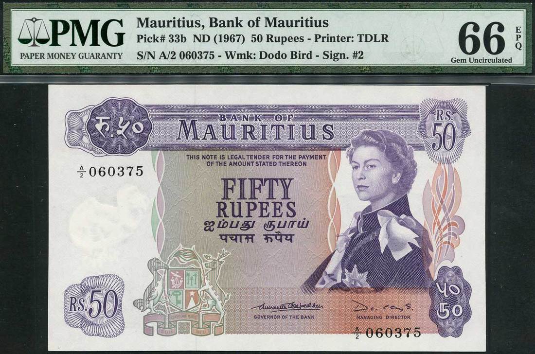 (x) Bank of Mauritius, 50 rupees, ND (1967), serial number A/2 060375, purple on multicolour underprint, Elizabeth II at right, arms at low left, value at centre and corners, reverse purple, ships and mountains