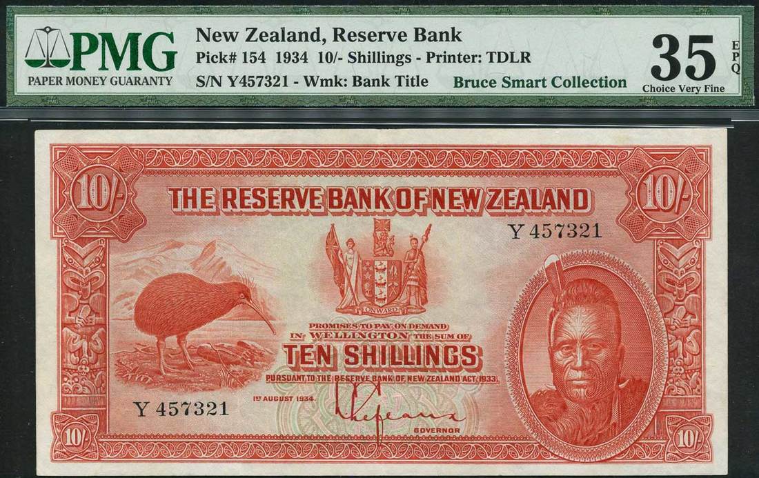 (x) Reserve Bank of New Zealand, 10 shillings, 1 August 1934, serial number Y457321, red on green and red underprint, Maori King Tawhiao at right, Kiwi bird at left, arms at centre, value at corners, reverse red, Milford Sound at centre