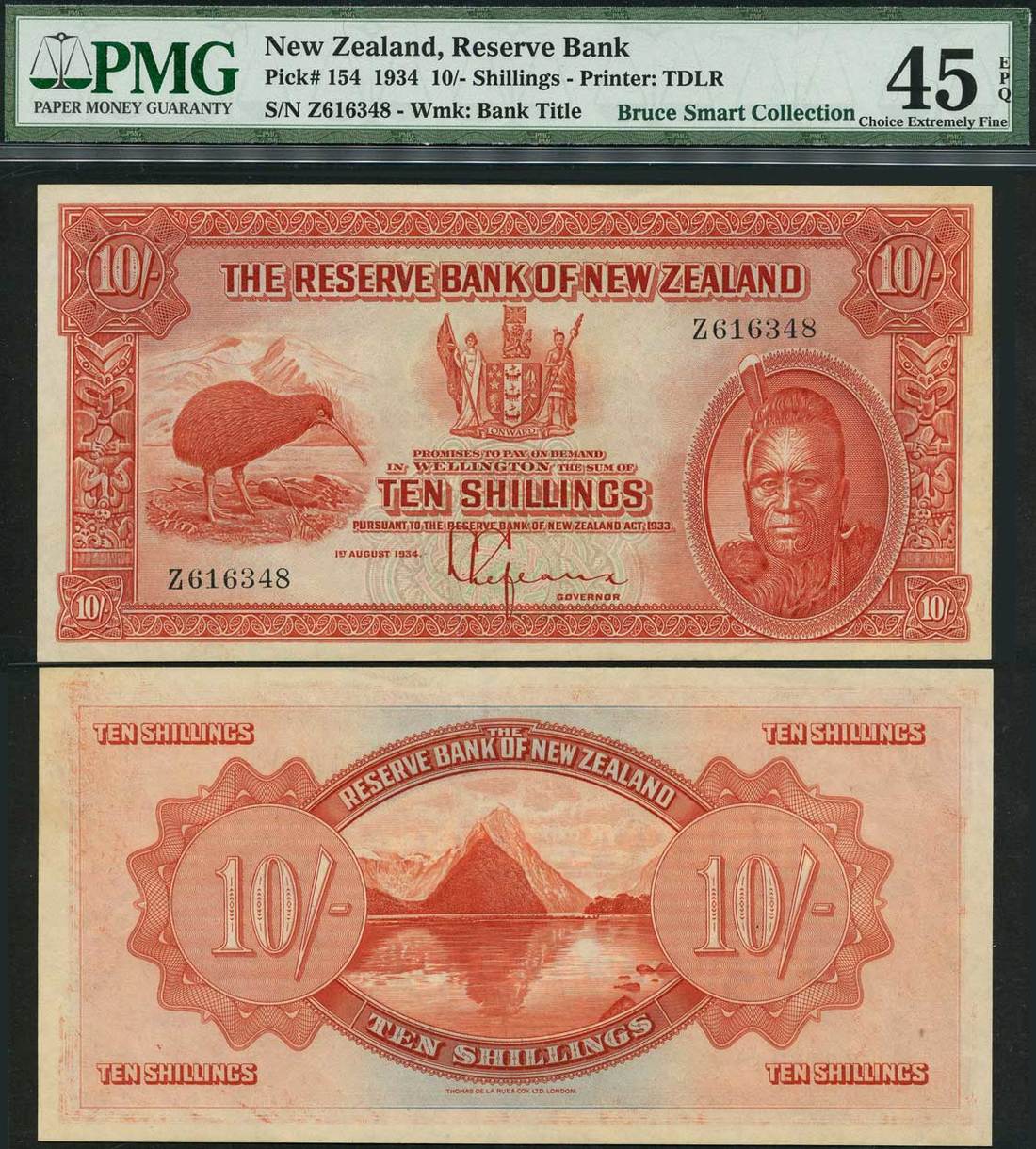 (x) Reserve Bank of New Zealand, 10 shillings, 1 August 1934, serial number Z616348, red on green and red underprint, Maori King Tawhiao at right, Kiwi bird at left, arms at centre, value at corners, reverse red, Milford Sound at centre