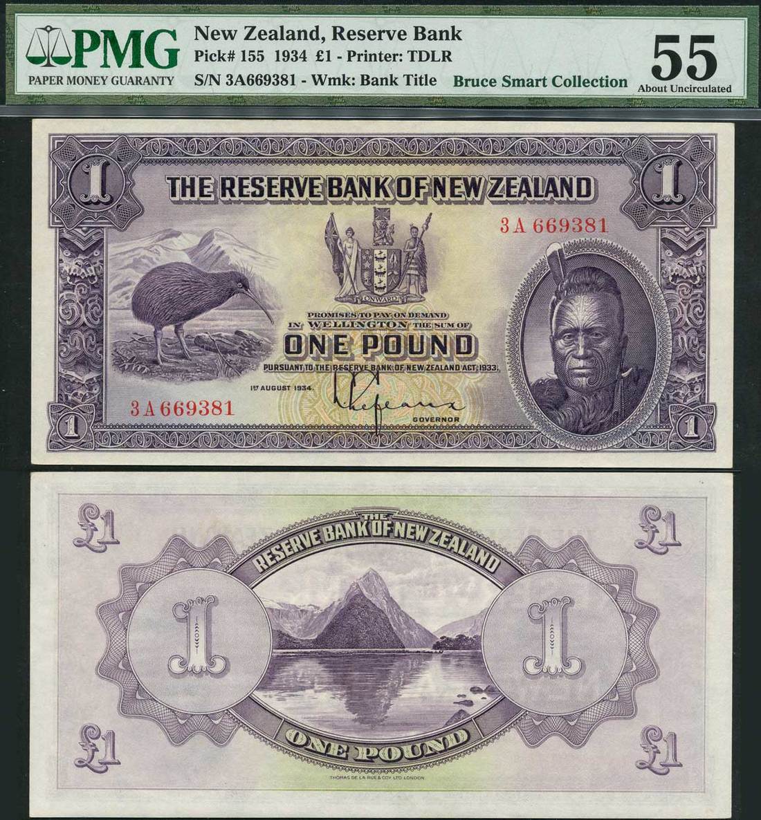 (x) Reserve Bank of New Zealand, £1, 1 August 1934, serial number 3A669381, purple on tan underprint, Maori King Tawhiao at right, Kiwi bird at left, arms at centre, value at corners, reverse purple, Milford Sound at centre