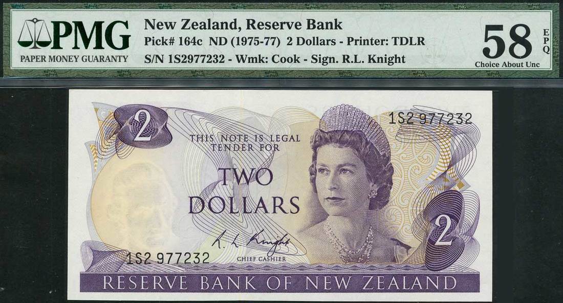 (x) Reserve Bank of New Zealand, a small group of notes comprising $1, ND (1975), prefix C10, brown, $2, ND (1975), prefix 1S2, purple, $1 (2), ND (1981 and 1985), prefixes ABS and AJL, brown, and $2, ND (1981), prefix EBY, purple, all with Elizabeth II at right,