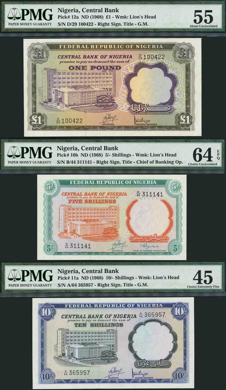 (x) Central Bank of Nigeria, a set of the 1968 issue comprising 5 and 10 shillings, and £1, green/orange, black/blue, and brown/purple respectively, all with bank building at left, industry and agriculture on reverse
