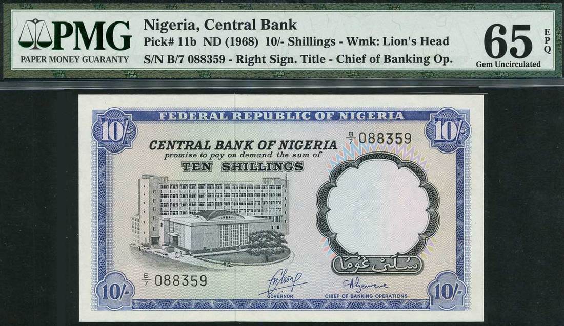 (x) Central Bank of Nigeria, 10 shillings, ND (1968), serial number B/7 088359, blue and black on multicolour underprint, bank building at left, value at each corner, reverse blue, workers with ground-nut sacks