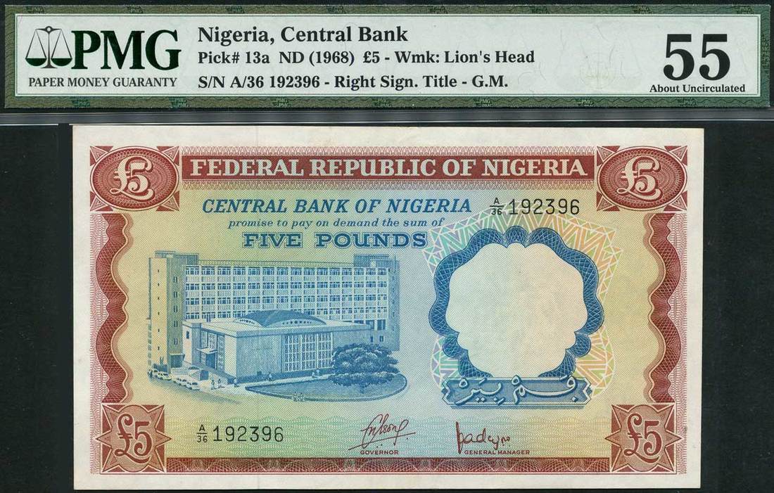 (x) Central Bank of Nigeria, £5, ND (1968), serial number A/36 192396, red and turquoise on multicolour underprint, bank building at left, value at each corner, reverse red, cacao harvesting
