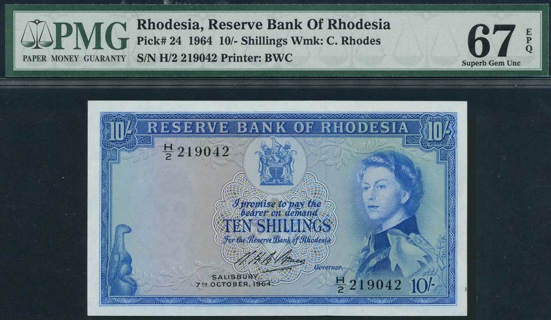 (x) Reserve Bank of Rhodesia, 10 shillings, 7 October 1964, serial number H/2 219042, blue on multicolour underprint, Elizabeth II at right, Zimbabwe Bird at low left, arms at top centre, reverse blue, tobacco field