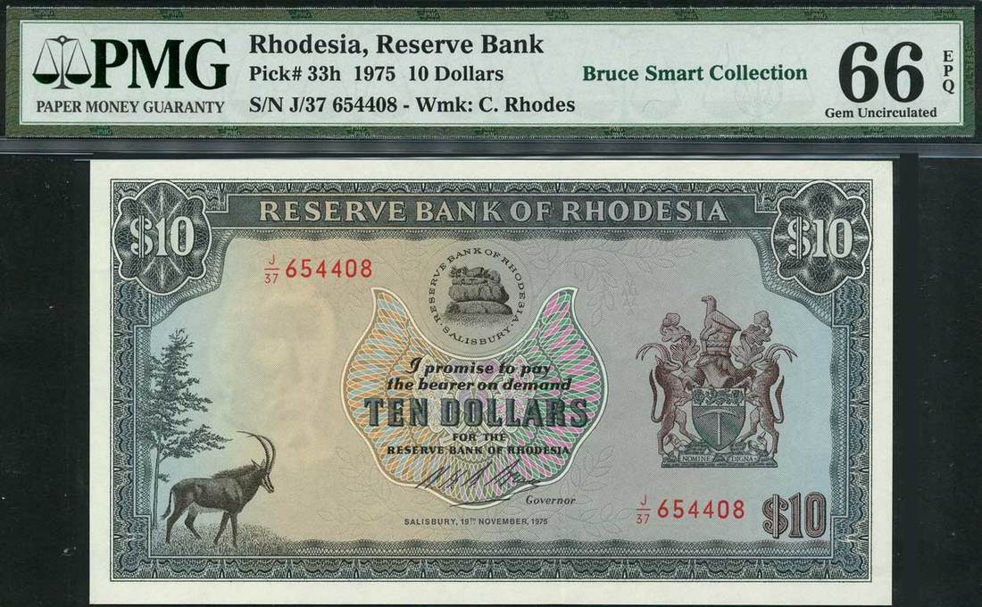 (x) Reserve Bank of Rhodesia, a full set of the first dollar issue, comprising $1, 17 February 1970, blue, $2, 5 August 1977, red, $5, 16 October 1972, brown, and $10, 19 November 1975, grey-green, all with arms at right