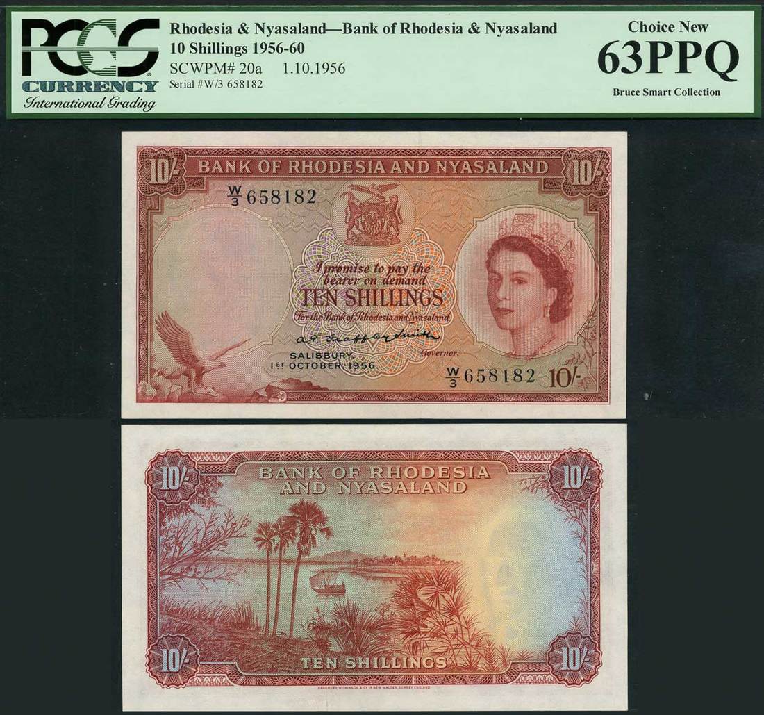 (x) Bank of Rhodesia and Nyasaland, 10 shillings, 1 October 1956, serial number W/3 658182, red-brown, Elizabeth II at right, arms at top centre, eagle at low left, reverse red-brown, view of river with sailing boat