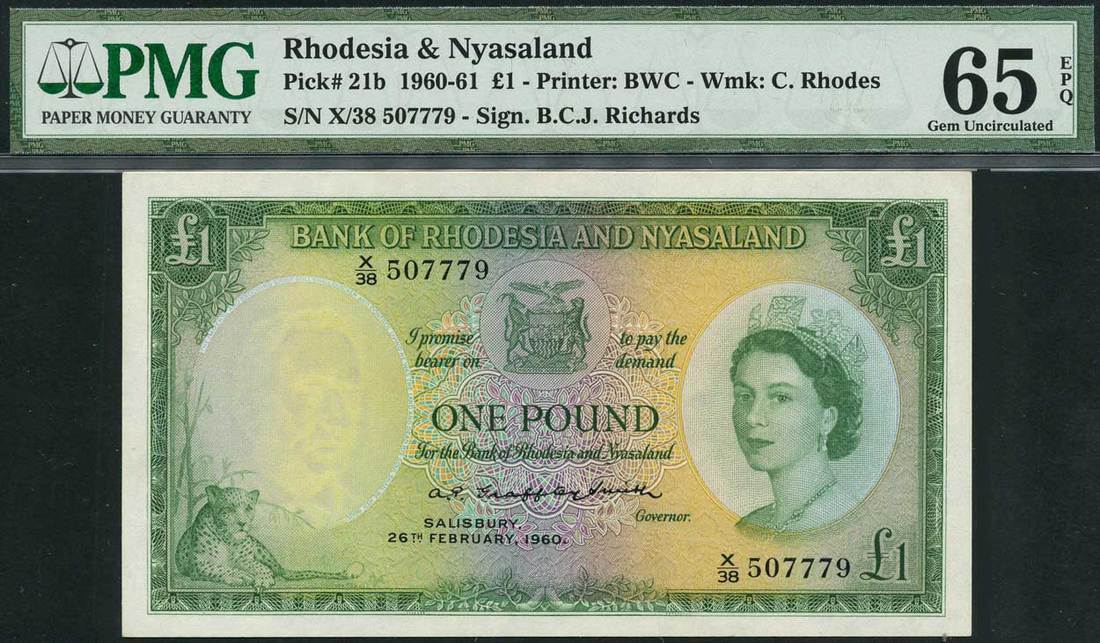 (x) Bank of Rhodesia and Nyasaland, £1, 26 February 1960, serial number X/38 507779, green on multicolour underprint, Elizabeth II at right, arms at top centre, leopard at low left, reverse green, view of Great Zimbabwe ruins