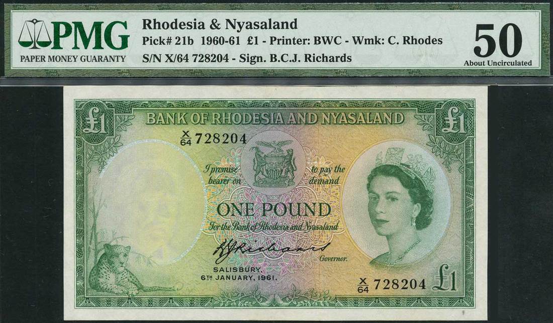 (x) Bank of Rhodesia and Nyasaland, £1, 6 January 1961, serial number X/64 728204, green on multicolour underprint, Elizabeth II at right, arms at top centre, leopard at low left, reverse green, view of Great Zimbabwe ruins