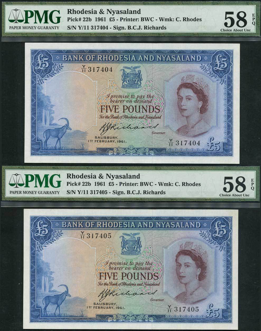 (x) Bank of Rhodesia and Nyasaland, £5 (2), 1 February 1961, serial numbers Y/11 317404-405, blue on multicolour underprint, Elizabeth II at right, arms at top centre, ibex at low left, reverse blue, view of Victoria Falls