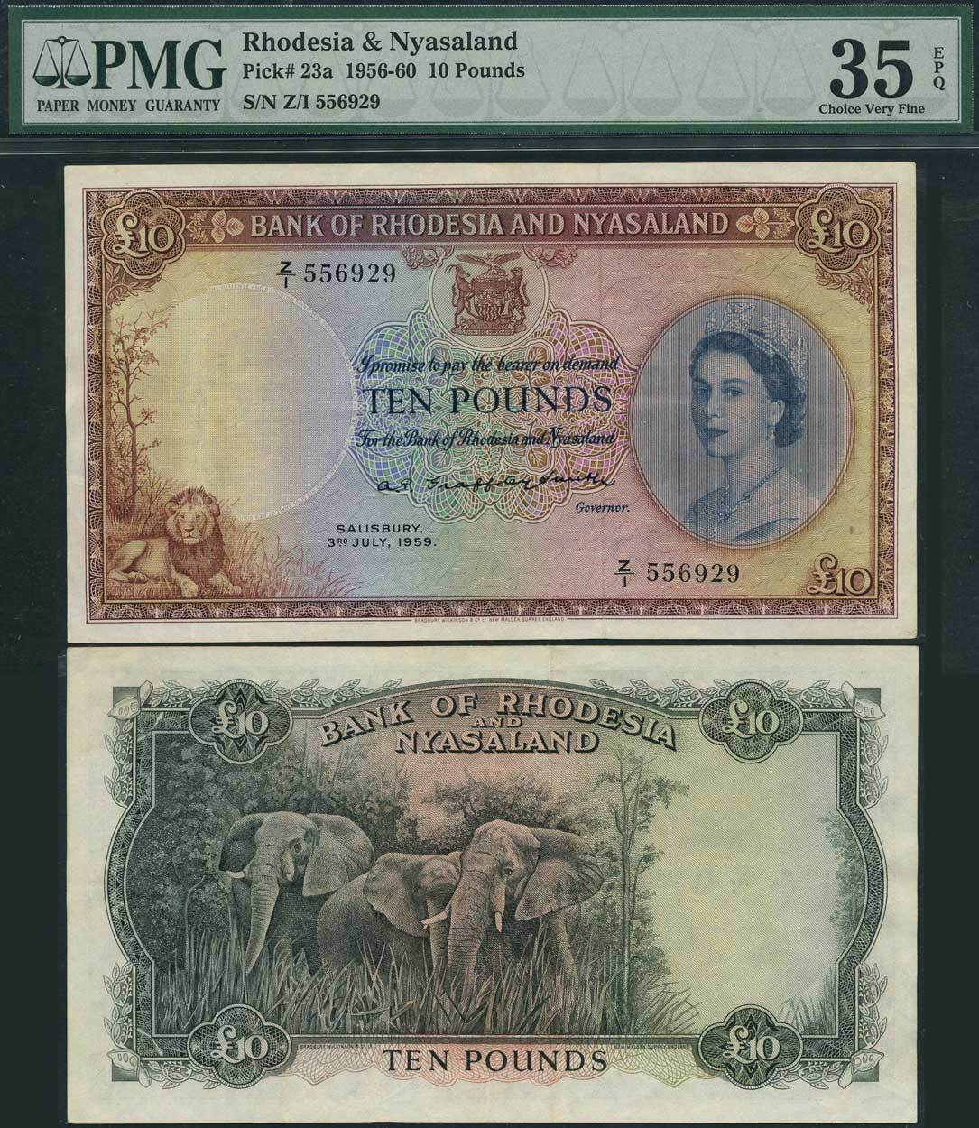 (x) Bank of Rhodesia and Nyasaland, £10, 3 July 1959, serial numbers Z/1 556929, brown and blue on multicolour underprint, Elizabeth II at right, arms at top centre, lion at low left, reverse dark grey, elephants at centre