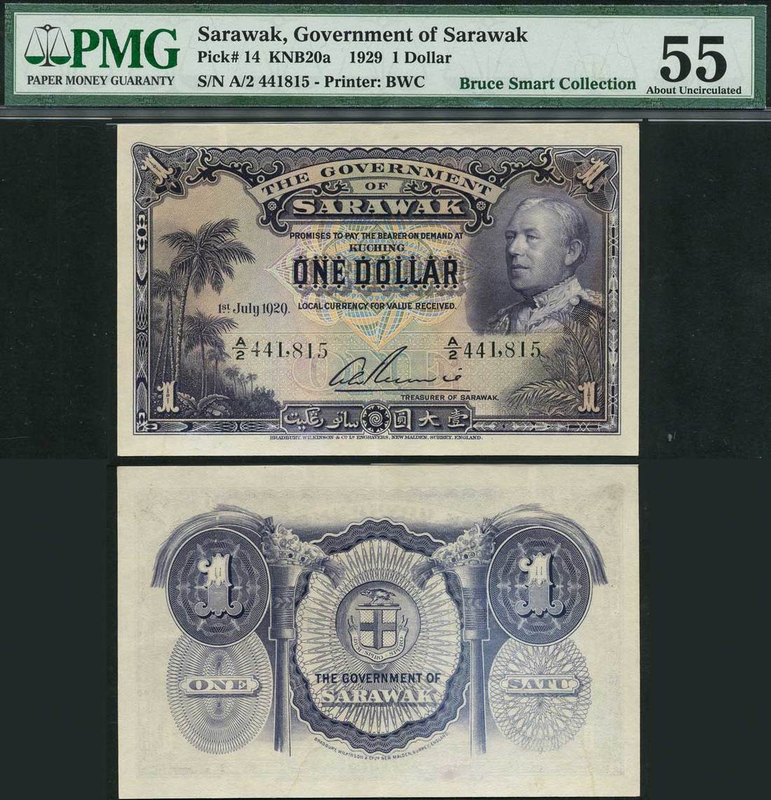(x) Government of Sarawak, $1, 1 July 1929, serial number A/2 441815, purple on multicolour underprint, Charles Vyner Brooke at right, palm trees at left, reverse purple, arms at centre