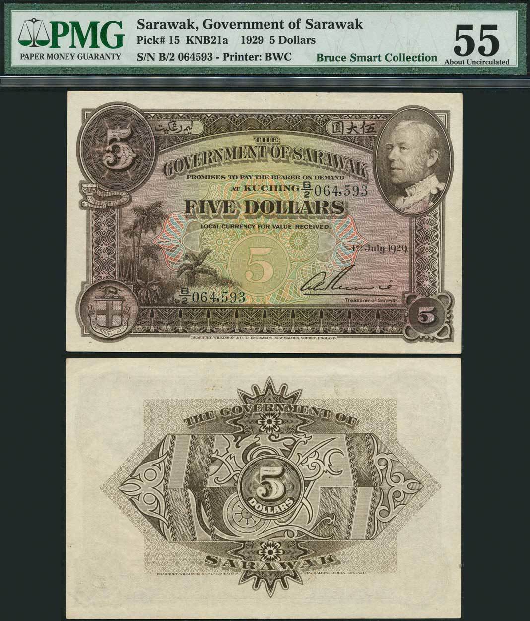 (x) Government of Sarawak, $5, 1 July 1929, serial number B/2 064593, brown on multicolour underprint, Charles Vyner Brooke at top right, palm trees at left, arms at low left, reverse brown, value at centre