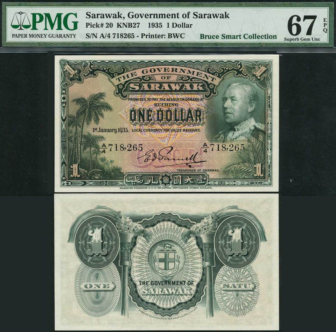 (x) Government of Sarawak, $1, 1 January 1935, serial number A/4 718265, green on multicolour underprint, Charles Vyner Brooke at right, palm trees at left, reverse green, arms at centre