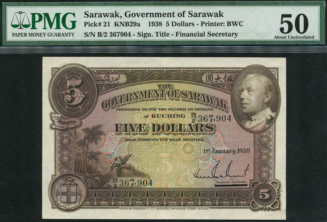 (x) Government of Sarawak, $5, 1 January 1938, serial number B/2 367904, brown on multicolour underprint, Charles Vyner Brooke at top right, palm trees at left, arms at low left, reverse brown, value at centre