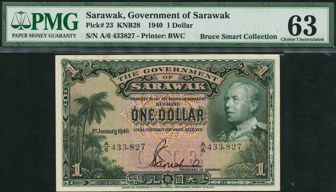 (x) Government of Sarawak, $1, 1 January 1940, serial number A/6 433827, green on multicolour underprint, Charles Vyner Brooke at right, palm trees at left, reverse green, arms at centre