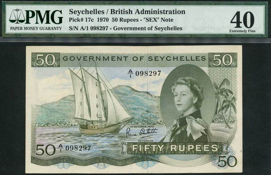 (x) Government of Seychelles, 50 rupees, 1 October 1970, serial number A/1 098297, brown, green and blue, Elizabeth II at right, sailing boat at left