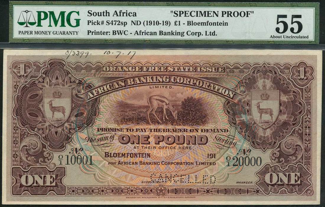 (x) African Banking Corporation Ltd., Orange Free State issue, archival specimen £1, ND (1910-19), serial number range O/1 10001-20000, maroon on multicolour underprint, antelope at top centre, arms at top left and right, value at corners, CANCELLED perforation