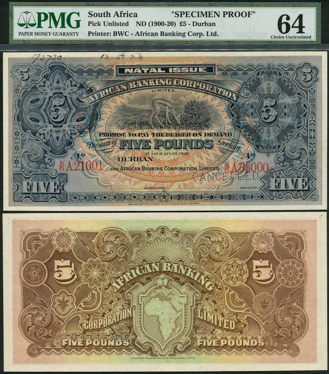 (x) African Banking Corporation Ltd., Natal issue, archival specimen £5, ND (1900-20), serial number range N/5 A21001-36000, dark blue on multicolour underprint, antelope at top centre, arms at top left and right, value at corners, CANCELLED perforation