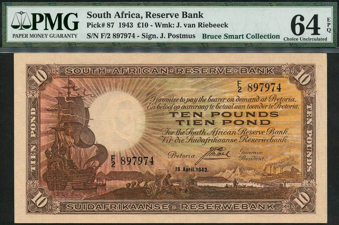 (x) South African Reserve Bank, £10, 19 April 1943, serial number F/2 897974, brown on multicolour underprint, galleon at left, value at each corner, reverse brown, arms at centre