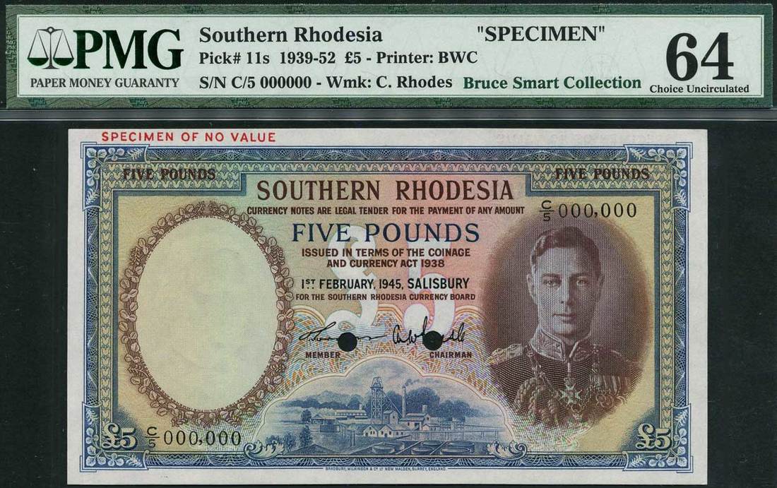 (x) Southern Rhodesia, Currency Board, specimen £5, 1 February 1945, serial number C/5 000000, blue on multicolour underprint, George VI at right, Wankie Colliery at low centre, value at corners, reverse blue, ibex at left, arms at top centre, Victoria Falls at centre, two cancellation holes and red SPECIMEN OF NO VALUE overprint in top margin