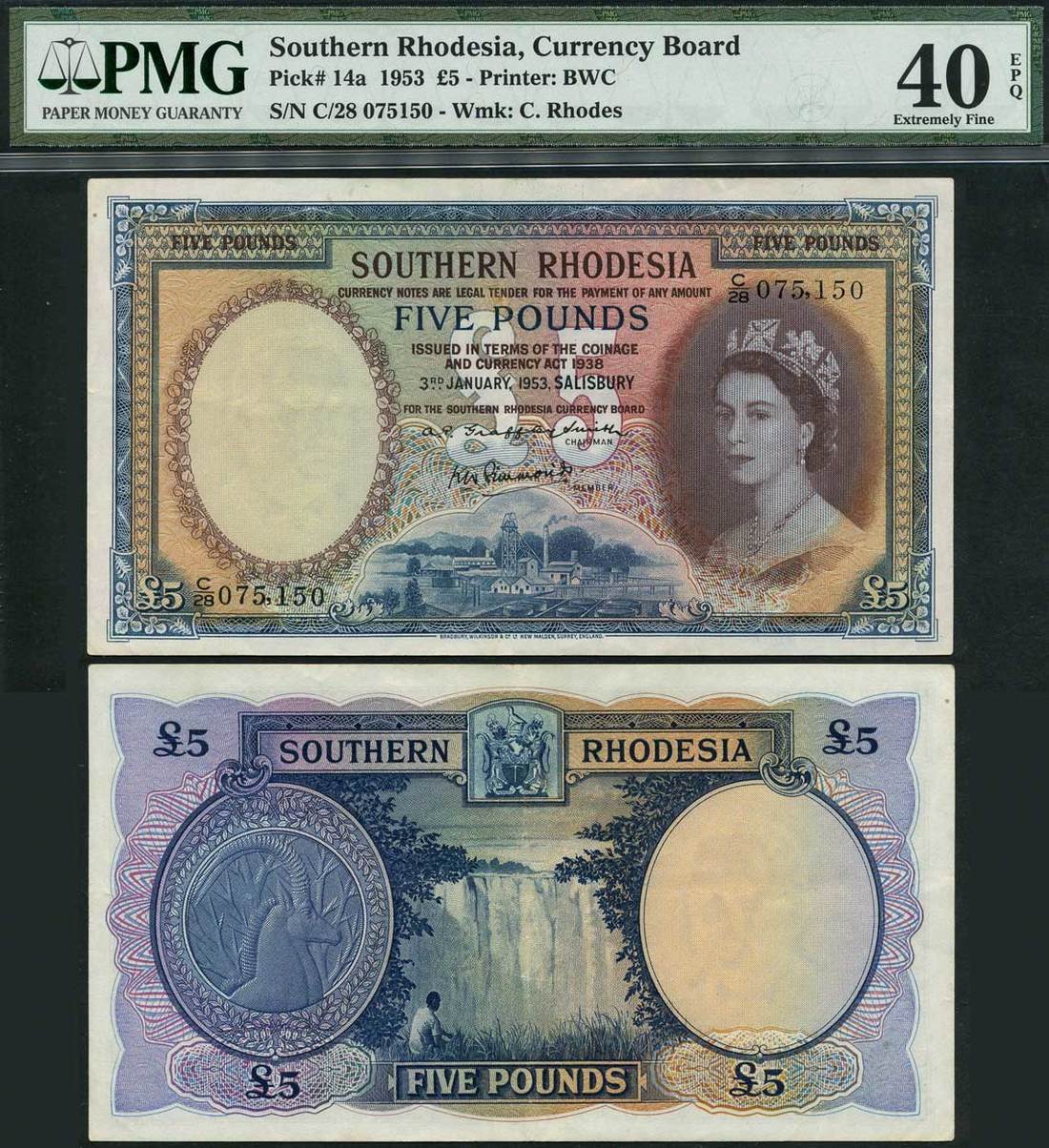 (x) Southern Rhodesia, Currency Board, £5, 3 January 1953, serial number C/28 075150, blue on multicolour underprint, Elizabeth II at right, Wankie Colliery at low centre, value at corners, reverse blue, ibex at left, arms at top centre, Victoria Falls at centre
