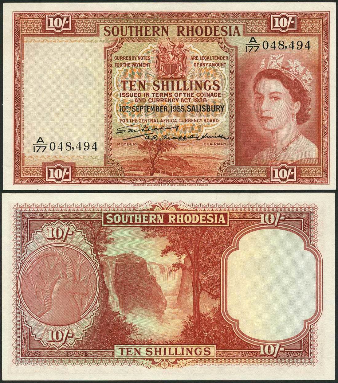 (x) Southern Rhodesia, Central Africa Currency Board, 10 shillings, 10 September 1955, serial number A/177 048494, red-brown, Elizabeth II at right, arms at top centre, landscape and tree at low centre, value at corners, reverse red-brown, ibex at left, Victoria Falls at centre