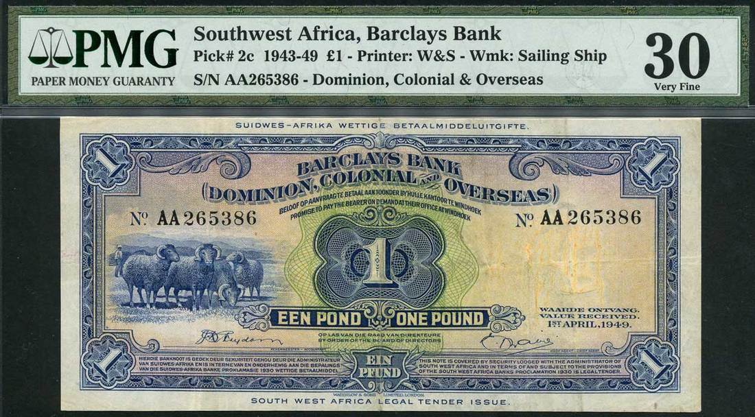 (x) Barclays Bank (Dominion, Colonial and Overseas), Southwest Africa, £1, 1 April 1949, serial number AA265386, blue on multicolour underprint, sheep at left, value at centre and corners, reverse blue and yellow, arms at centre
