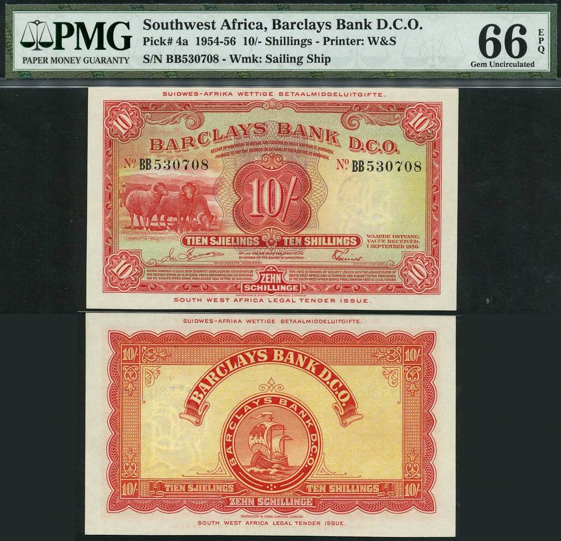 (x) Barclays Bank (Dominion, Colonial and Overseas), Southwest Africa, 10 shillings, 1 September 1956, serial number BB530708, red on multicolour underprint, sheep at left, value at centre and corners, reverse red and yellow, arms at centre