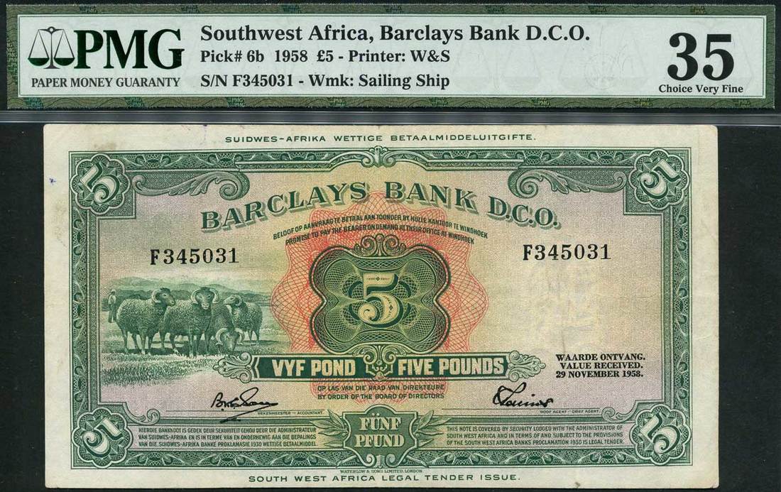 (x) Barclays Bank (Dominion, Colonial and Overseas), Southwest Africa, £5, 29 November 1958, serial number F345031, green on multicolour underprint, sheep at left, value at centre and corners, reverse green and yellow, arms at centre