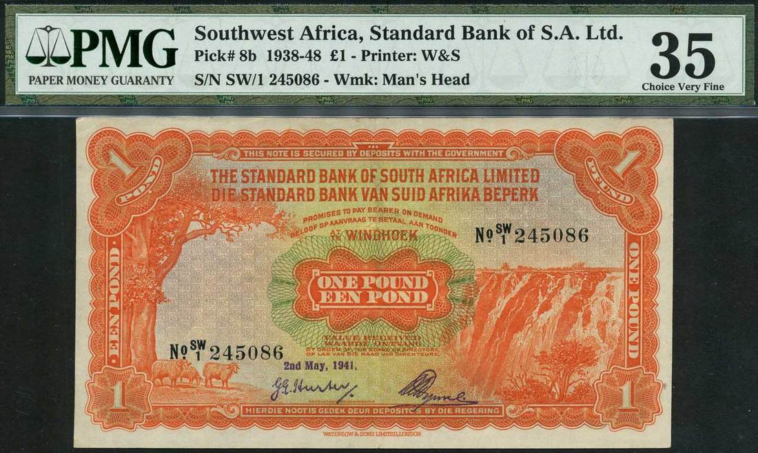 (x) Standard Bank of South Africa Ltd., Southwest Africa, £1, 2 May 1941, serial number SW/1 245086, orange on multicolour underprint, sheep and tree at left, waterfall at right, value at centre and corners, reverse orange, kudu at centre, value at left