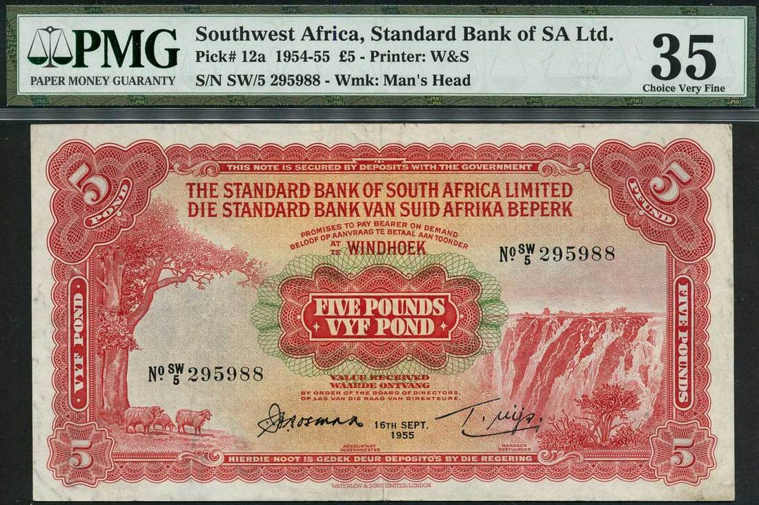 (x) Standard Bank of South Africa Ltd., Southwest Africa, £5, 16 September 1955, serial number SW/5 295988, red on multicolour underprint, sheep and tree at left, waterfall at right, value at centre and corners, reverse red, kudu at centre, value at left