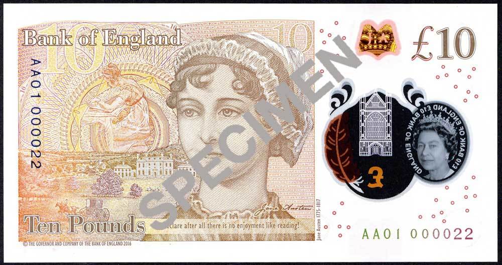 Bank of England, Victoria Cleland, £10 on polymer, ND (14 September 2017), serial number AA01 000022, orange-brown, Queen Elizabeth II at right, transparent window at left with portrait of the Queen and view of Winchester Cathedral, the latter highlighted in gold. To the right of Winchester Cathedral is a quill, which shows as orange or purple depending on angle of view. Reverse orange-brown, a portrait of Jane Austen. To her left is an illustration of Elizabeth Bennet, the central character in 'Pride and Prejudice'. A foil silver image at left depicts Winchester Cathedral