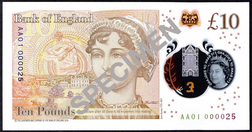 Bank of England, Victoria Cleland, £10 on polymer, ND (14 September 2017), serial number AA01 000025, orange-brown, Queen Elizabeth II at right, transparent window at left with portrait of the Queen and view of Winchester Cathedral, the latter highlighted in gold. To the right of Winchester Cathedral is a quill, which shows as orange or purple depending on angle of view. Reverse orange-brown, a portrait of Jane Austen. To her left is an illustration of Elizabeth Bennet, the central character in 'Pride and Prejudice'. A foil silver image at left depicts Winchester Cathedral